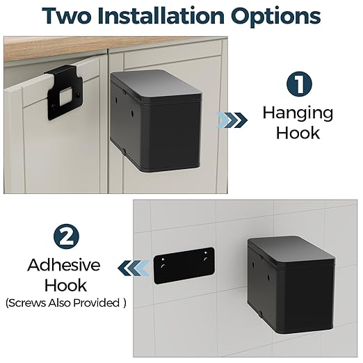 - Place Anywhere You Need - This trash can is designed to be used in three ways: hanging, sticking (wall mounted) and standing. It works great with reusable garbage bags, suitable for cabinet, kitchen, bathroom, bedroom, living room, office, toilet, apartments, RV, laundry, etc. Space saving and environmentally friendly bin can use conveniently wherever you need it.