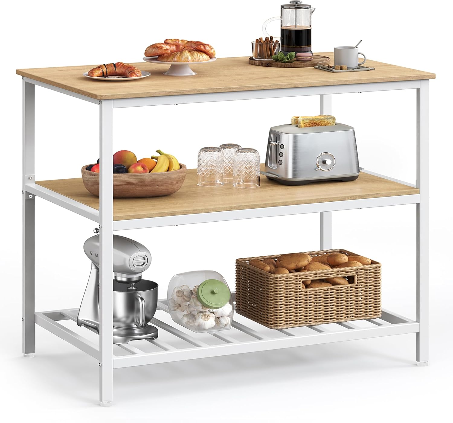 VASAGLE Kitchen Island with 3 Shelves, 39.4 Inches Width Kitchen Shelf with Large Worktop, Stable Steel Structure, Industrial, Easy to Assemble, Oak Color and White UKKI005W09