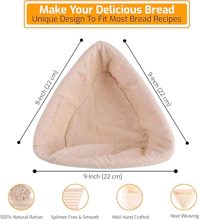 - Complete Triangle Bread Baking Set: This kit includes two 9-inch triangle bread proofing baskets made of 100% natural Indonesian rattan, perfect for crafting unique sourdough loaves