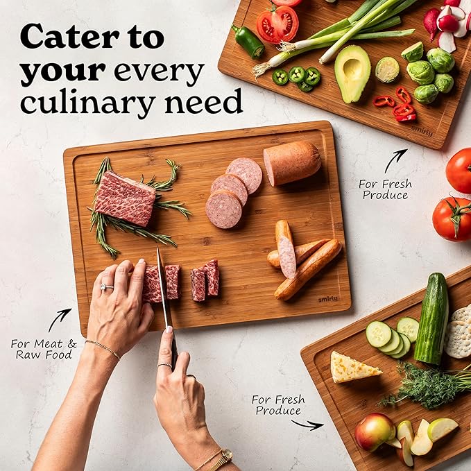 - 3-Pack for Comprehensive Coverage - Enjoy a complete kitchen solution with our 3-pack bamboo cutting boards. With three different sizes, this set ensures you have the right board for every task, from small chopping jobs to larger meal preparations.