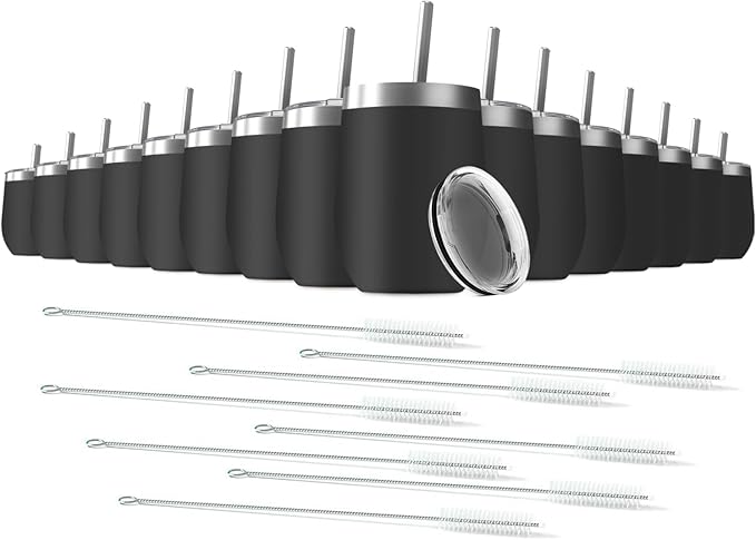12oz Wine Tumbler with Lid With straw Stainless Steel Wine Tumbler Cups Double Wall Vacuum Insulated Travel Mugs Stemless Cup 16 Pack (Black)
