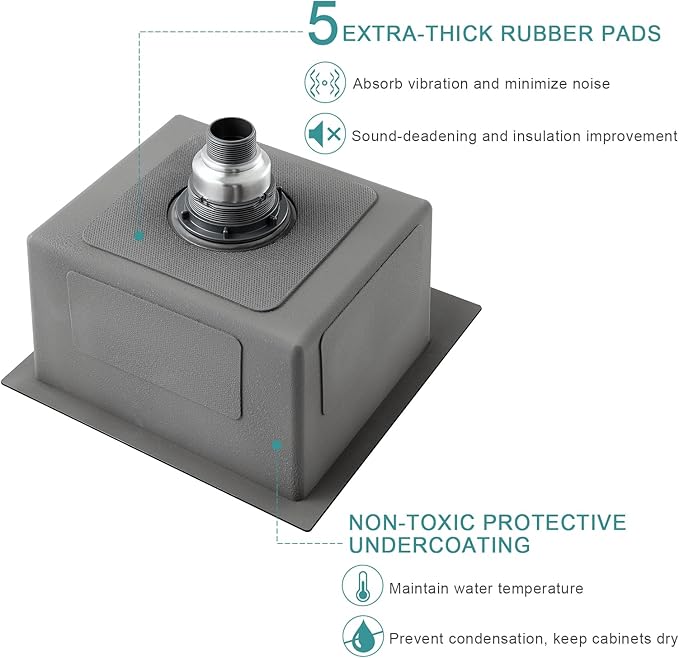 - 【Sound Dampening Kitchen Sink】To create a quieter kitchen environment, we added sound-absorption undercoating and sound-dampening rubber pads to the bottom of the sink to reduce the noise and vibration, meanwhile, prevent moisture accumulation, keep cabinets dry and clean