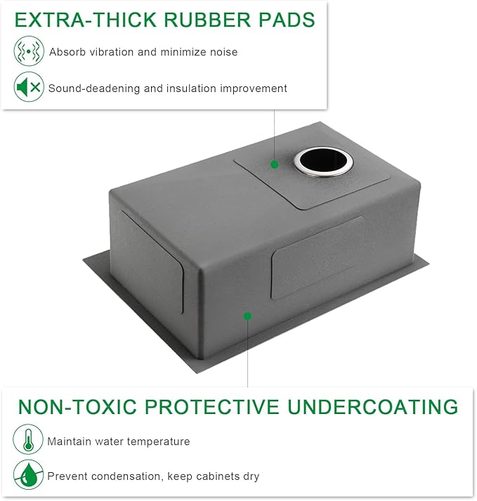 - 【Quiet Kitchen Sink】Thick rubber pads installed on the bottom of this drop in bar sink and with heavy paint coating, the sound of washing and garbage disposal gets appeased and it ultimately protects your cabinet from condensation while draining boiling water