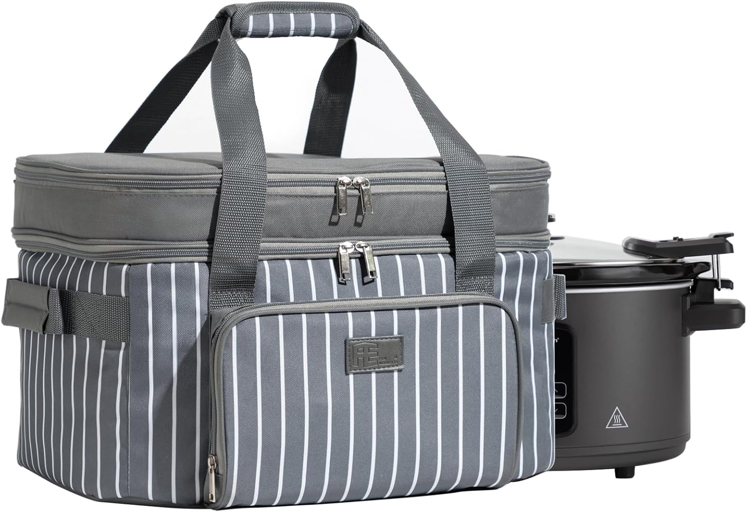 Fun Elements Double Layer Slow Cooker Carrier Bag for 6-8 Quart Oval CrockPot, Insulated Crock Pot Travel Bag with Support Pad and Adjustable Straps, Top Zip Compartment and Front Pocket for Utensils