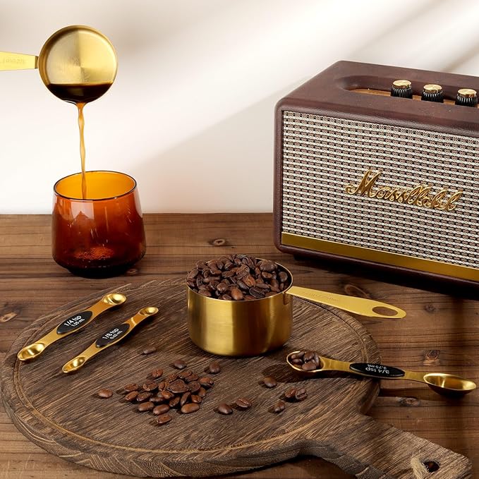 - Durable and sturdy: Measuring cups and measuring spoons set are made of premium high quality food grade stainless steel with gold Stainless steel wire drawing process which means that will never rust, not stain or erode, so your cooking is always safe and healthy, long lasting and always there for your family