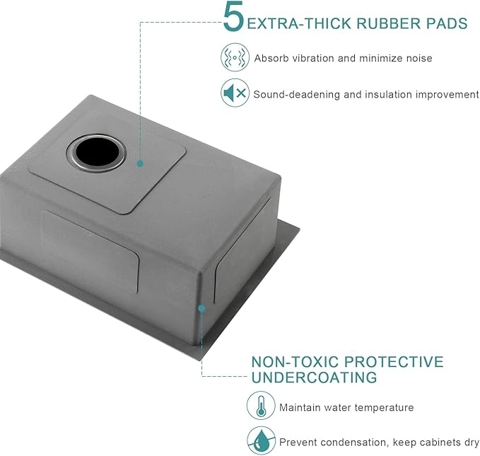 - 【Sound Dampening Kitchen Sink】To create a quieter kitchen environment, we added sound-absorption undercoating and sound-dampening rubber pads to the bottom of the sink to reduce the noise and vibration, meanwhile, prevent moisture accumulation, keep cabinets dry and clean