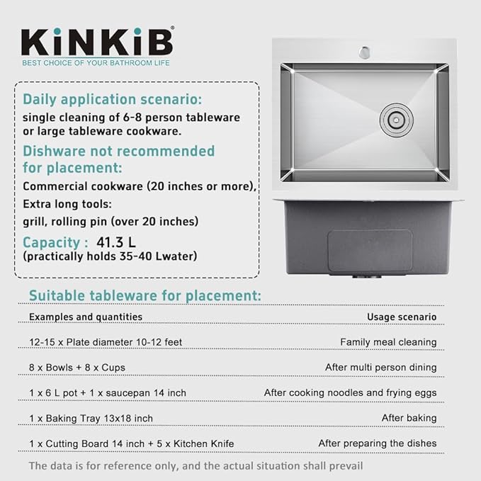 - 【Sink Dimensions】22 inch Drop in Kitchen Sink Single Bowl: 22" L x 18" W (front-to-back) x 9"D, Inner bowl dimension: 20"L x 14"W x 9"D, Bowl depth: 9 inch; Min Cabinet Size: 25". Package Includes a kitchen sink, protective bottom grid and basket strainer