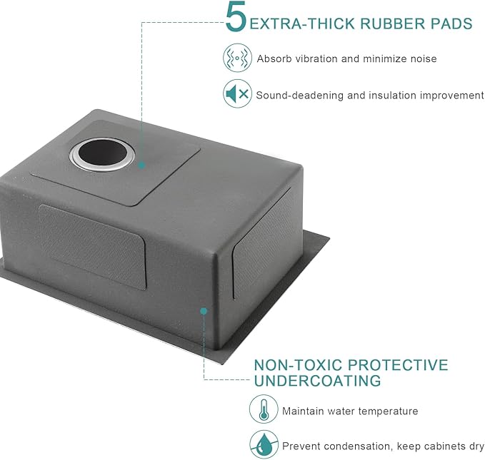 - 【Sound Dampening Kitchen Sink】To create a quieter kitchen environment, we added sound-absorption undercoating and sound-dampening rubber pads to the bottom of the sink to reduce the noise and vibration, meanwhile, prevent moisture accumulation, keep cabinets dry and clean