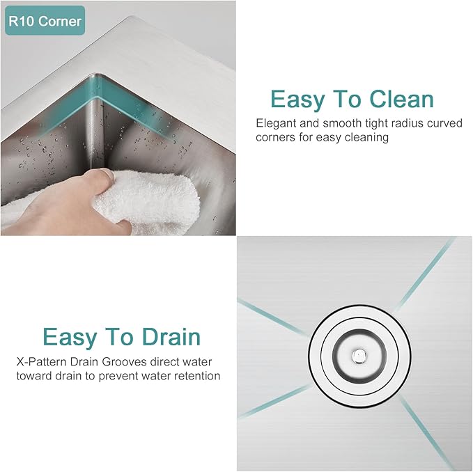 - 【Handcrafted by Skilled Artisans】The bottom is slightly tilted to prevent water from standing in the bowl. X grooves design is easy to drain. 3.5" drain opening matches standard garbage disposal unit in the US. The sink with gently R10 round corners for easy cleaning and maintenance