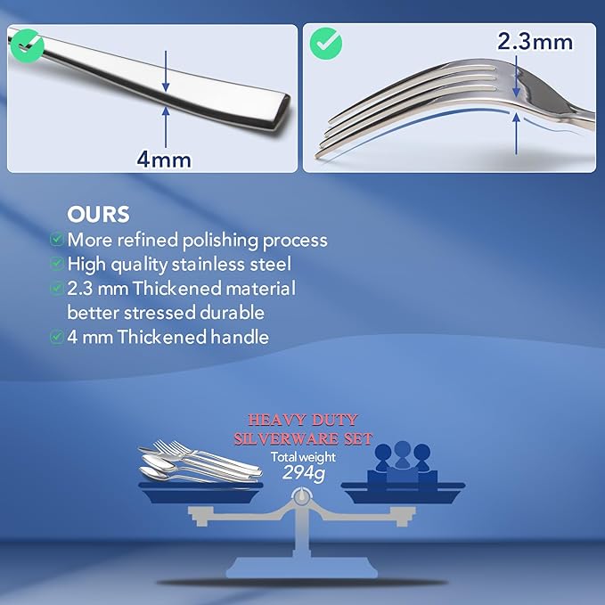 - 【Excellent Workmanship Silverware】Multiple times of fine polishing gives EIUBUIE spoons and forks set elegant fine mirror finish, nice shine and bring a high-grade and modern metallic texture, smooth and no rough edges, very comfortable to use without hurting your mouth at all