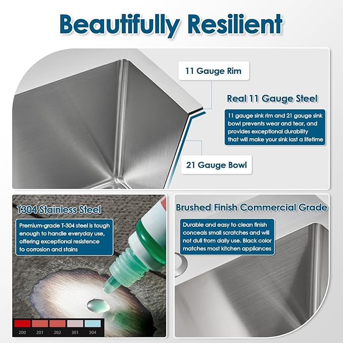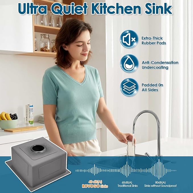 - Enhanced with soundproof rubber pads and anti-condensation undercoating, the small sink offers a quieter kitchen environment and protects your cabinets from potential water damage due to condensation build-up