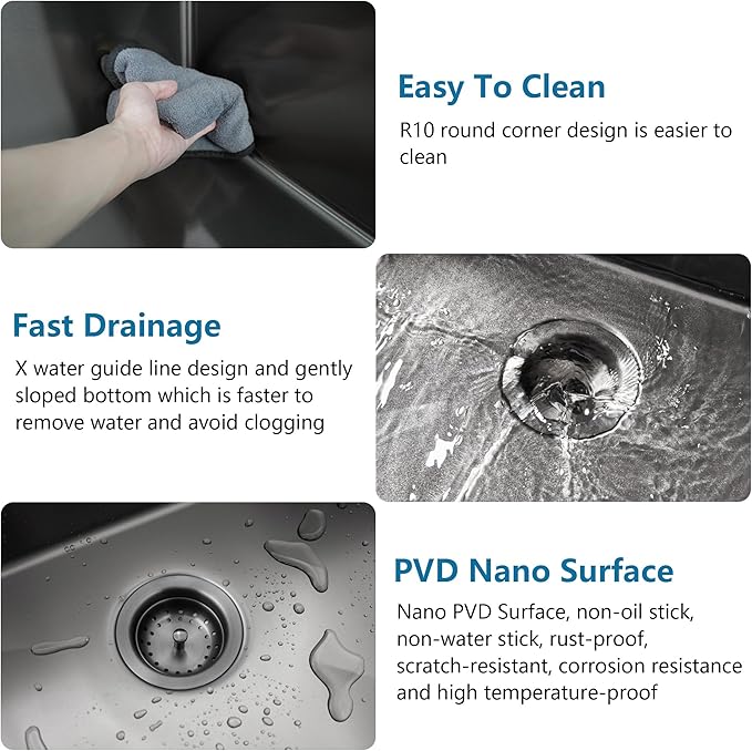 - Fast Drainage and Easy to Clean: this black sing bowl kitchen sink is designed with X water guide line on bottom and gently sloped bottom which are faster to remove water and avoid clogging. Heavy duty sound guard undercoatin and 3mm thick rubber pad assures exceptional noise reduction and quiet dependability and R10 round corner is easier to clean