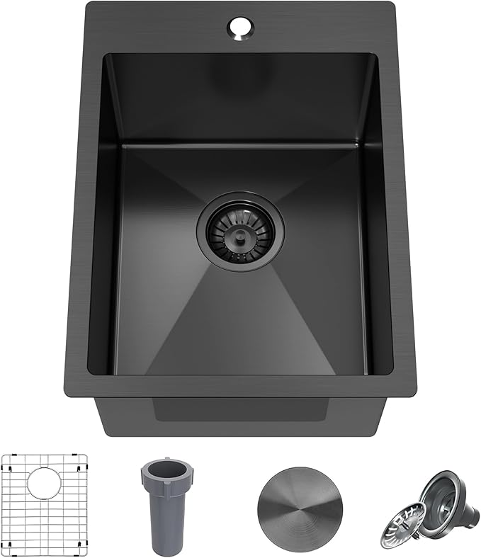 15x20 Inch Black Drop In Bar Sink, 18 Gauge T-304 Stainless Steel Single Bowl Topmount Sink with Grid & Drain, Black for Home/RV/Office