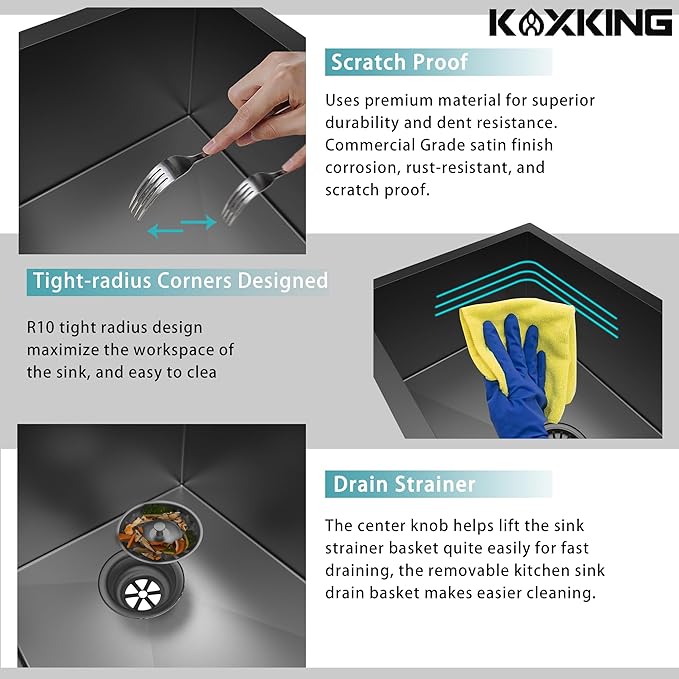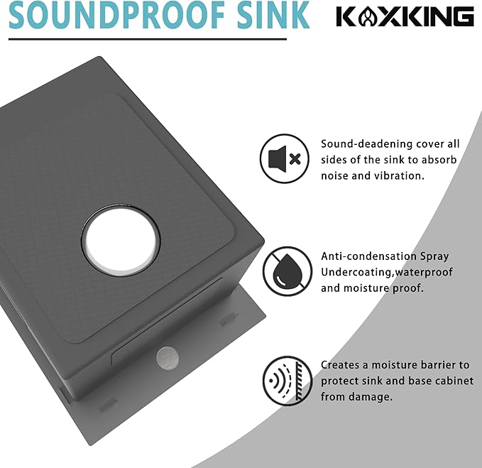 - Sound Barrier Technology: Three sound-proof pads have been added to the bottom of all our stainless steel Black Kitchen Sinks to reduce the sound of running water. An undercoating condensation layer minimizes noise and reduces condensation to protect your cabinet. X-Water Guideline: Water drains easily to avoid clogging.