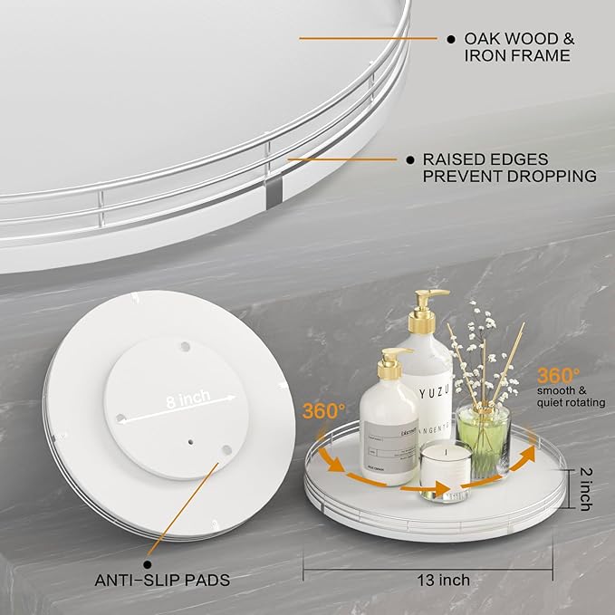 - ๐ง๐ต๐ผ๐๐ด๐ต๐๐ณ๐๐น ๐๐ฒ๐๐ถ๐ด๐ป: The turntable tray features a smooth and silent 360ยฐrotation; Bottom slip-resistant pads for stability and protect your countertop from scratches; Raised edges on each organizer tray to keep items from falling out; Easy to use, no installation required