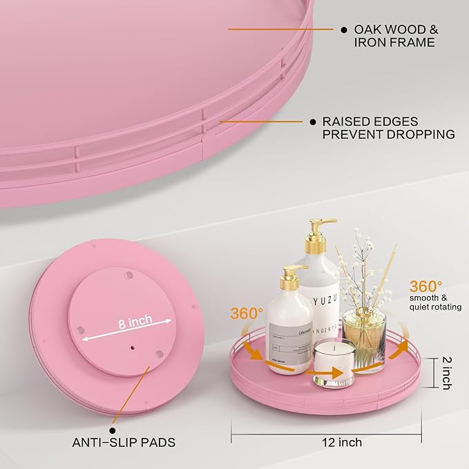 12" Oak Wood Bathroom Tray for Counter, Vanity Tray for Perfume Lotion Candle Makeup Jewelry Sink Soap Holder Turntable Dresser Organizer Countertop Coffee Table Decor Organization and Storage Pink