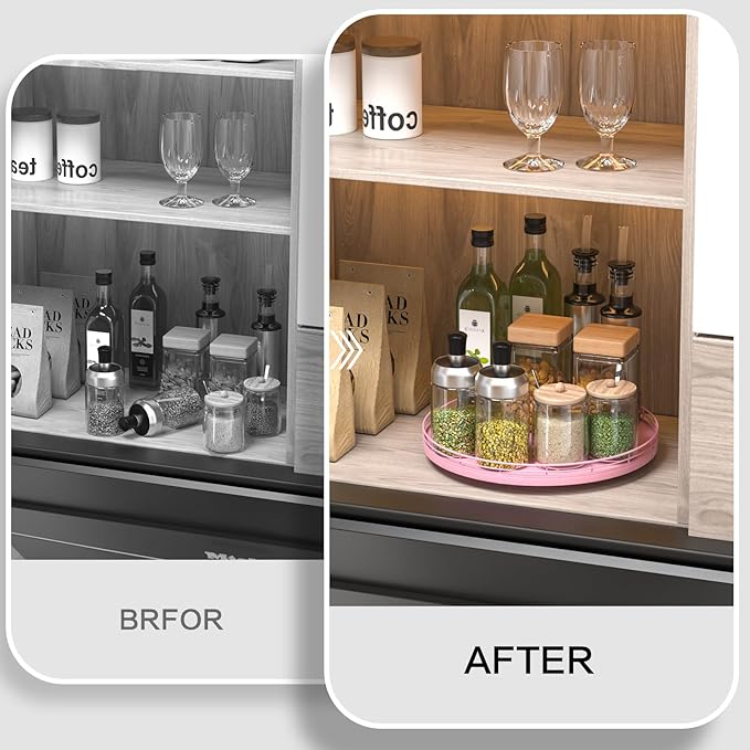 - ๐ง๐ต๐ผ๐๐ด๐ต๐๐ณ๐๐น ๐๐ฒ๐๐ถ๐ด๐ป: The turntable tray features a smooth and silent 360ยฐrotation; Bottom slip-resistant pads for stability and protect your countertop from scratches; Raised edges on each organizer tray to keep items from falling out; Easy to use, no installation required
