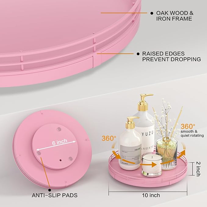 10" Oak Wood Bathroom Tray for Counter, Vanity Tray for Perfume Lotion Candle Makeup Jewelry Sink Soap Holder Turntable Dresser Organizer Countertop Coffee Table Decor Organization and Storage Pink
