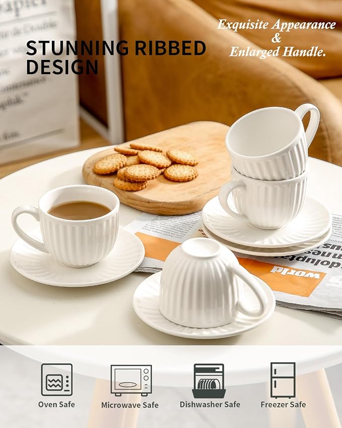 - Enhance Your Coffee Experience With Striking Ribbed Design: Elevate your coffee experience with a set of 4 elegant cappuccino cups and saucers featuring a unique ribbed design. These glossy white cups effortlessly complement your home decor