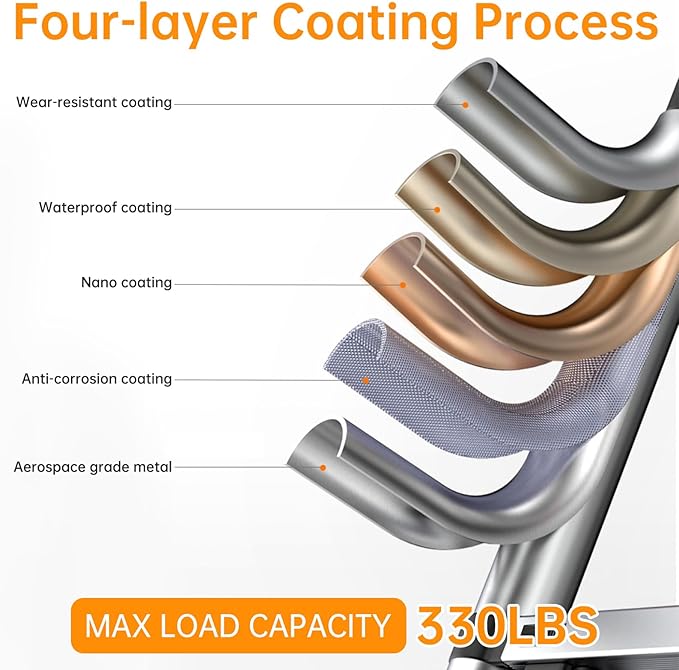 - 【Durable Aluminum Alloy Material】The telescoping ladder and platform are made of high-quality 6061 thick aluminum alloy. The aluminum surface is oxidized to prolong the service life of the folding ladder. The plastic parts of the ladder are reinforced with nylon fibers for increased load capacity up to 330 lbs/150 kg. The telescopic ladder complies with the EN131 safety standard and meets the daily use of the family.