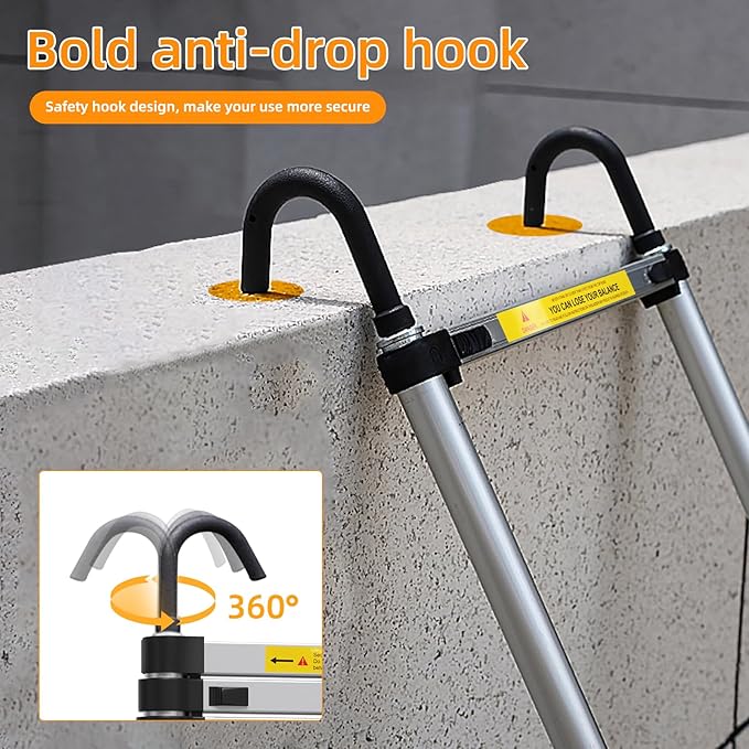 - 【Safe Locking Structure】Our multi-button folding telescopic ladder has two strong mechanical bolts at each step, instead of designing a one-key retract button, so that even one of the buttons can't work properly , while the other steps of the telescopic ladder can still remain in place without retracting, and the failure rate is low during use. Its non-slip, wear-resistant rubber feet keep the ladder firmly on the ground at all times, providing you with double safety.