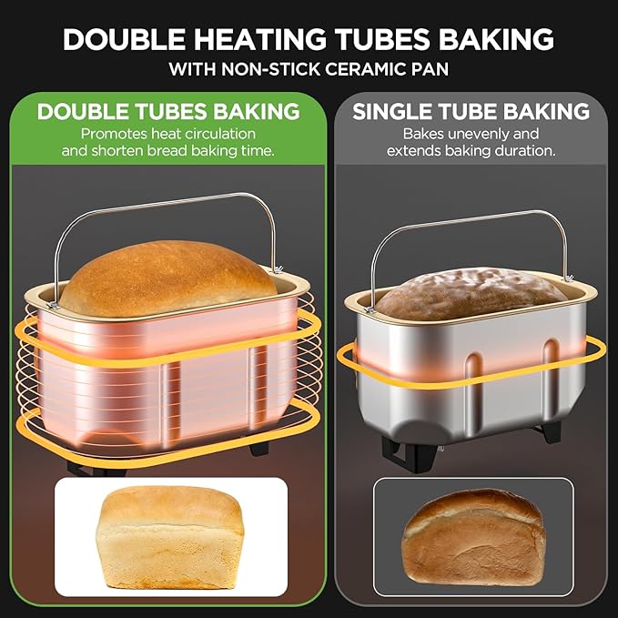- [Nonstick Ceramic Pan & Dual Kneading Paddle] New upgrade ceramic pan is 100% no chemicals and won't be sticked which is easy to wash. Beside, the breadmaker mixes and kneads ingredients more effectively by Dual Kneading Paddles, providing thorough dough kneading for a higher rise and a soft taste, elastic and chewy results.
