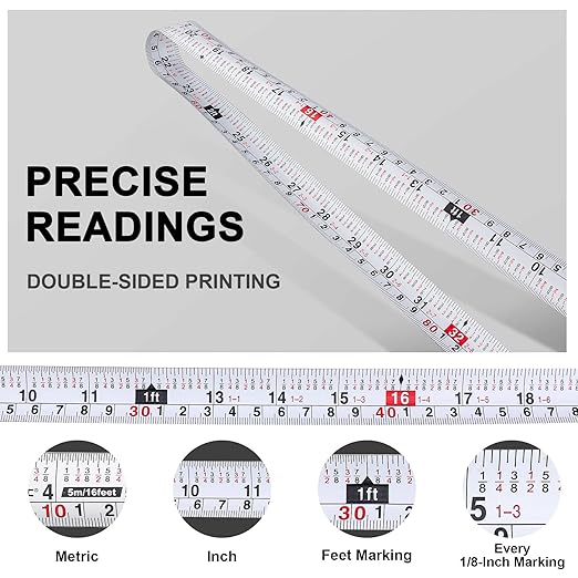 - 【High Accuracy: Dual Scales & 1/8" Fractions】Metric/Imperial scales coexist on the 16ft / 5M blade with crisp 1/8" markings – switch units instantly for international tutorials and achieve measurements right the first time on hardwood floors, custom curtains, or fine wood projects. No more second-guessing or conversions