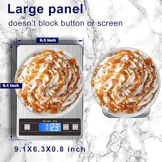 - 9”x 6.3” large stainless steel panel makes it super easy and durable to handle items in different shapes or larger containers without blocking the LCD display for readouts in g, kg, lb: oz, ml or fl.oz( 5 units of measurement). And the panel is water-proof so you can clean it easily.