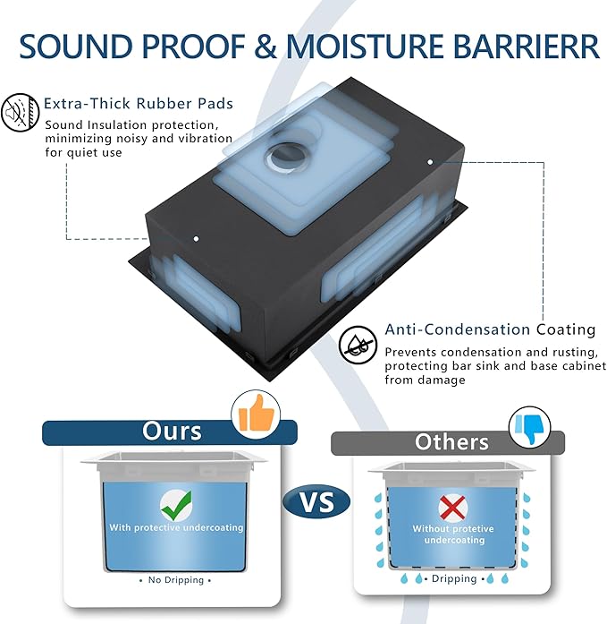 - Anti-Noise & Condensation Design: The drop in kitchen sink is equipped with soundproof materials to absorb running water noise and reduce vibration, thickened EVA silent pads and undercoating also prevent water condensation at the bottom of the sink.