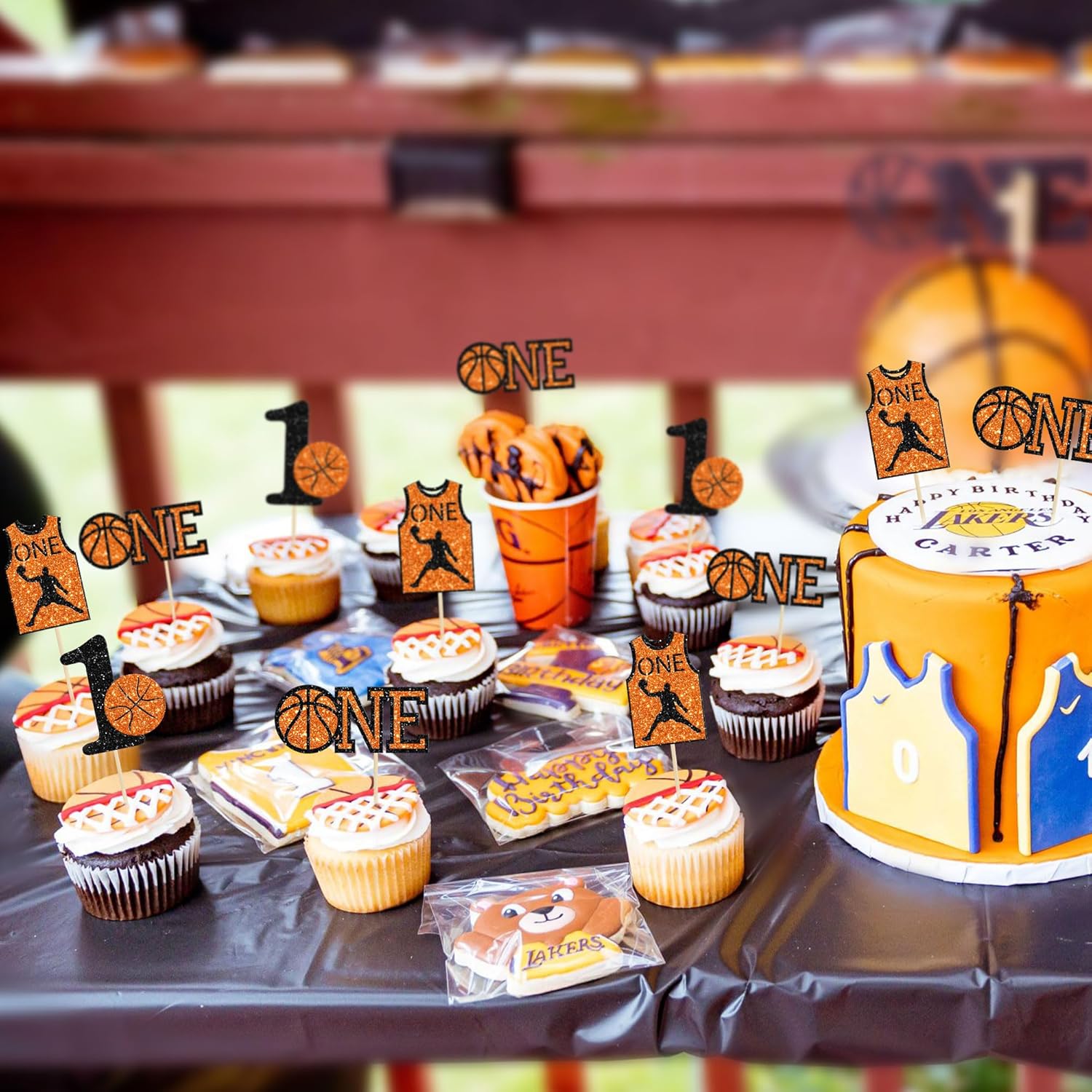 24Pcs Basketball One Cupcake Toppers Glitter Number 1 First Birthday Basketball Cupcake Picks for Sports Theme Baby Shower Kids 1st Birthday Party Cake Decorations Supplies