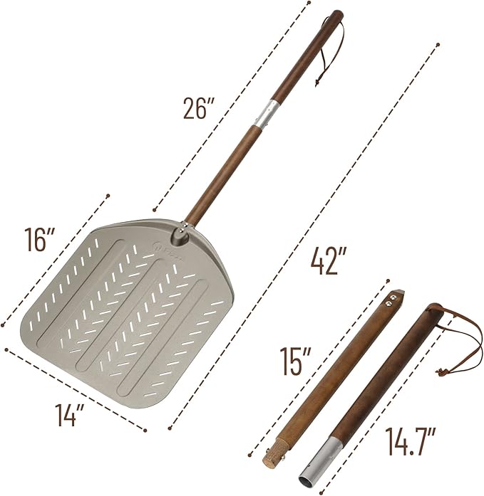 - 【Lightweight & Easy to Use】: Measures 14 x 16 inch and 40 inch long, the pizza peel is made of lightweight aluminum for durability and safety for food. It is easy to handle and use. Simply sprinkle a little corn flour on the metal surface for a non-stick surface, and you can slide your pizza off the spatula and onto your plate without any hassle. Great for both professional chefs and new learners.