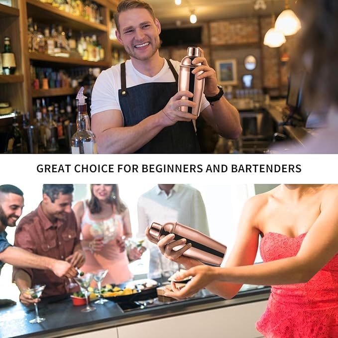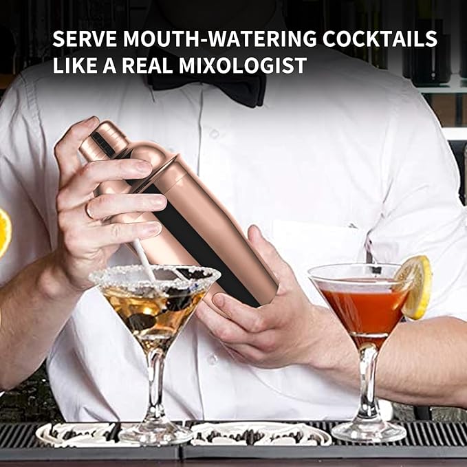 24oz Cocktail Shaker Bar Set, Martini Shaker with Built-In Strainer, Measuring Jigger, Mixing Spoon, Professional Stainless Steel Large Bartender Drink Shaker Margarita alcohol Mixer-Rose Gold