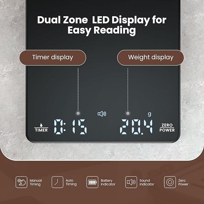 - 【Three Units & Two Modes】The Espresso Digital Timer Scale has three units of measurement (g/oz/ml) that can be converted at any time. The small coffee scale has two built-in timing modes, automatic and manual, allowing you to time the coffee brewing process accurately. This feature ensures that your coffee is always delicious and perfectly brewed to your taste.