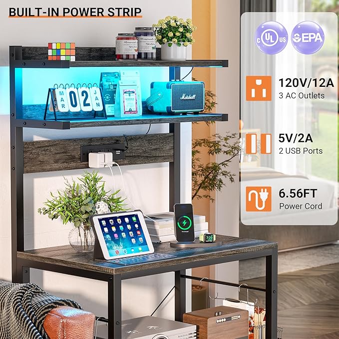 - 【Bakers Rack with Power Outlets】Our kitchen storage shelf includes 3 AC outlets + 2 USB charging ports to provide power for up to 5 devices simultaneously, Easily charge the coffee or bread maker in your kitchen. don't need to move around to find a power source and keep your kitchen tidy and organized.