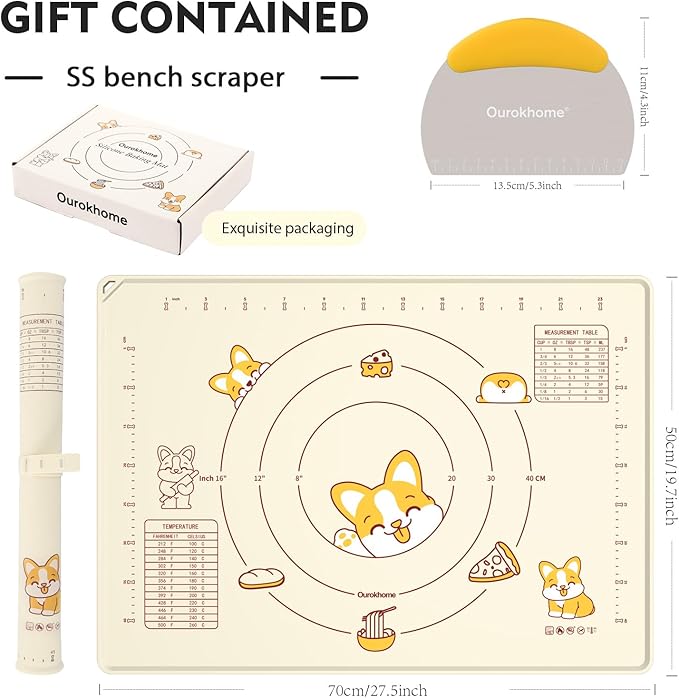 - Your go-to solution for hassle-free baking: Made from high-quality food-grade soft platinum silicone. Save your countertop from getting messy. Say goodbye to floor all over the flour. Included a bench scraper with scale and conversion table