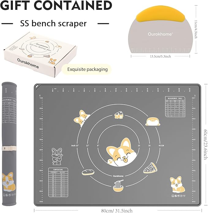 - Your go-to solution for hassle-free baking: Made from high-quality food-grade soft platinum silicone. Save your countertop from getting messy. Say goodbye to floor all over the flour. Included a bench scraper with scale and conversion table