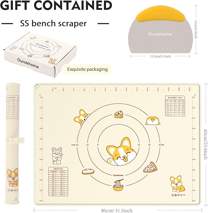 - Your go-to solution for hassle-free baking: Made from high-quality food-grade soft platinum silicone. Save your countertop from getting messy. Say goodbye to floor all over the flour. Included a bench scraper with scale and conversion table