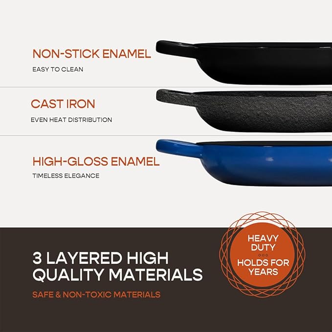 - SUPERIOR QUALITY: Boasting a 3-layer enamel coating that protects against wear and tear, this enameled cast iron Dutch oven with lid exemplifies top-tier craftsmanship. Krustic enameled bread Dutch ovens are compatible with various heat sources, including gas, ceramic, induction, and electric stoves. While the enameled cast iron cookware set is robust enough for daily use, hand-washing is recommended to maintain the cast iron pot with lid in pristine condition.