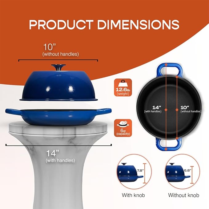 - ULTIMATE DUTCH OVEN SET: Krustic enameled cast iron Dutch oven brings a game-changing innovation to your kitchen! Measuring 14" in diameter with handles, 10" without handles, 7.8" high with the knob, and 6.8" without the knob and weighing 12.6 lbs, this 6 quart pot with lid is a perfect size to create your culinary masterpiece. Our bread oven includes a non-stick, easy-to-clean, dishwasher-safe silicone mat sized 21.4" x 8.2", a care manual, and a homemade recipes book.