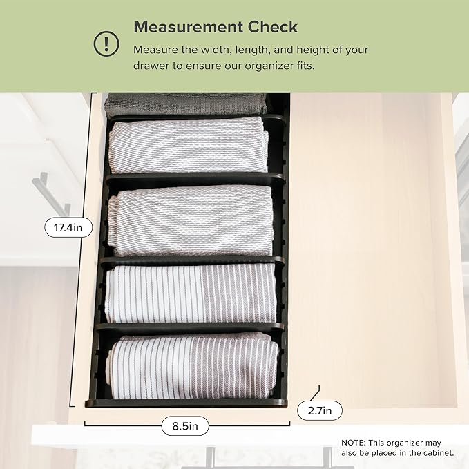- ORGANIZE ALL OF YOUR ESSENTIALS. Store your towels or food storage lids with ease. Our patented organizer design offers up to 6 compartments (includes 5 adjustable dividers). Create the configuration that works best for you!