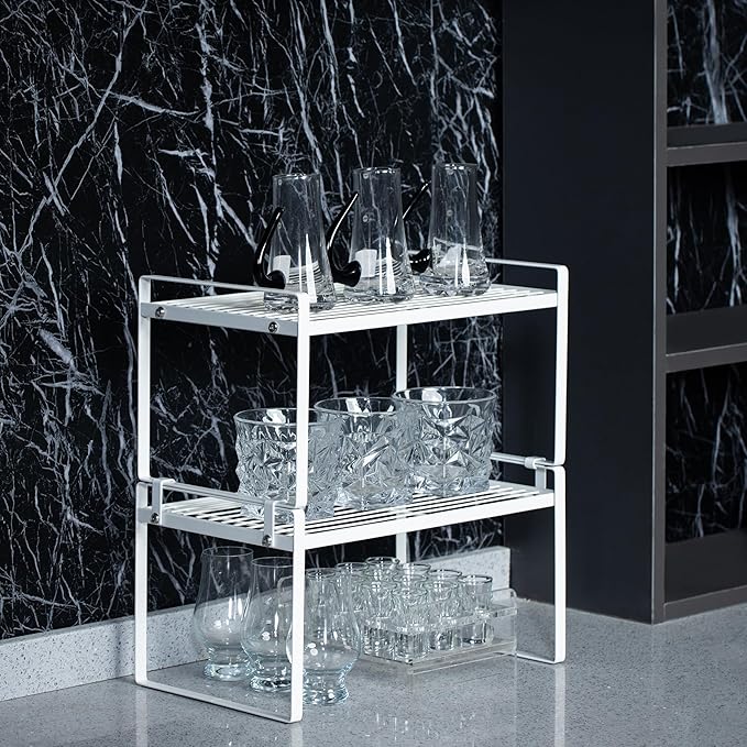 - EXTRA SPACE: These stackable cabinet shelves maximize storage efficiency, providing more spaces as a riser which allows you to use the upper space. The added storage space helps organization and tidiness. All the wee little bottles, tins, vials, pans and a myriad of other kitchen utensils could go underneath, the middle or the top of the cabinet shelf, reaching with ease.