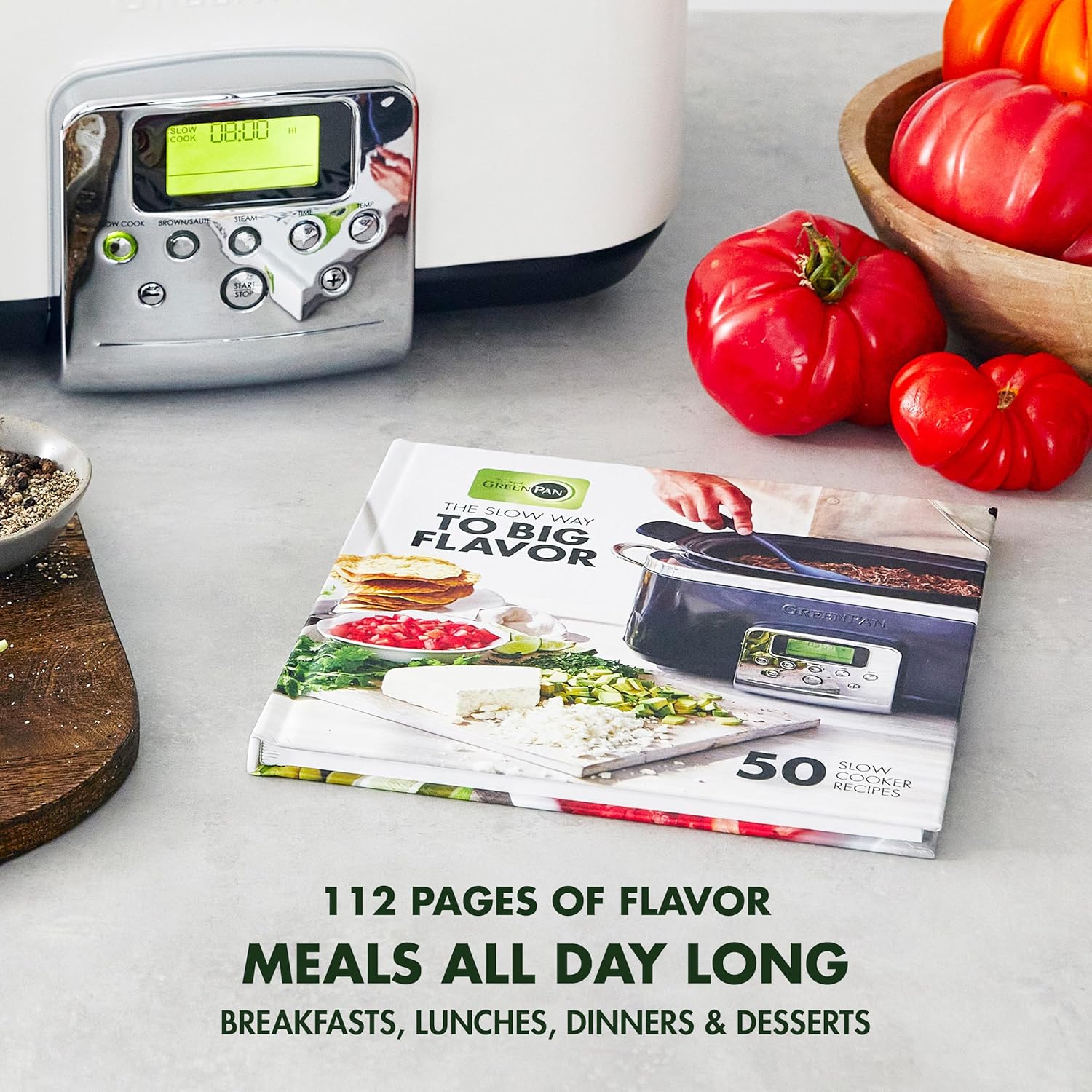 GreenPan Elite Electric Slow Cooker Cookbook, Hardcover, 50 Simple Step Recipes, Breakfast Lunch Dinner Dessert Meals, Quick Easy Tips