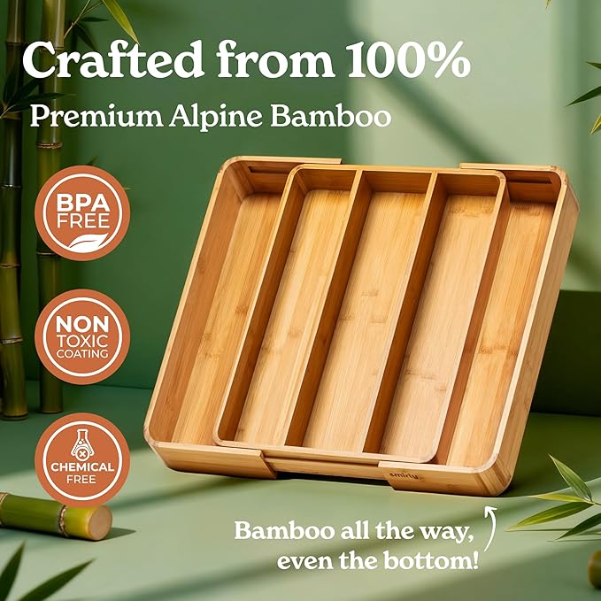 - A Purchase You'll Feel Great About - Made from sustainable bamboo, our bamboo drawer organizer is durable and easy to clean with rounded corners. This silverware holder is eco-friendly, user-friendly, and keeps your kitchen stylishly organized.