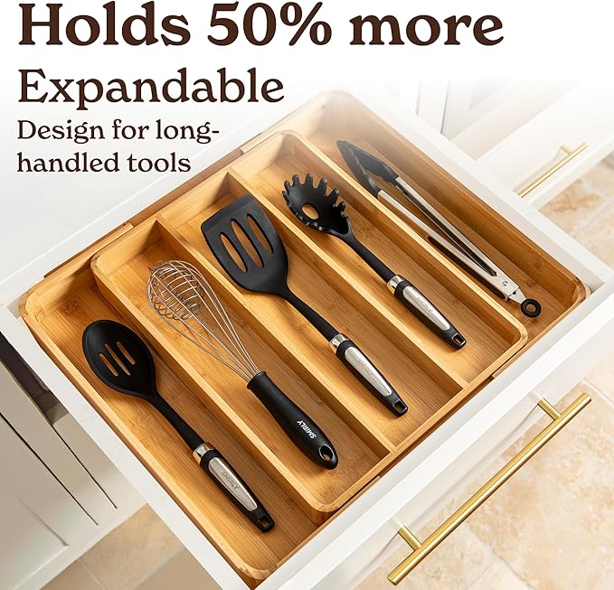 - An Organizing Space Saver - Our 5-compartment expandable bamboo kitchen drawer organizer adapts to fit any drawer size, providing customizable storage for silverware and kitchen utensils. This versatile design keeps your kitchen neat and organized.