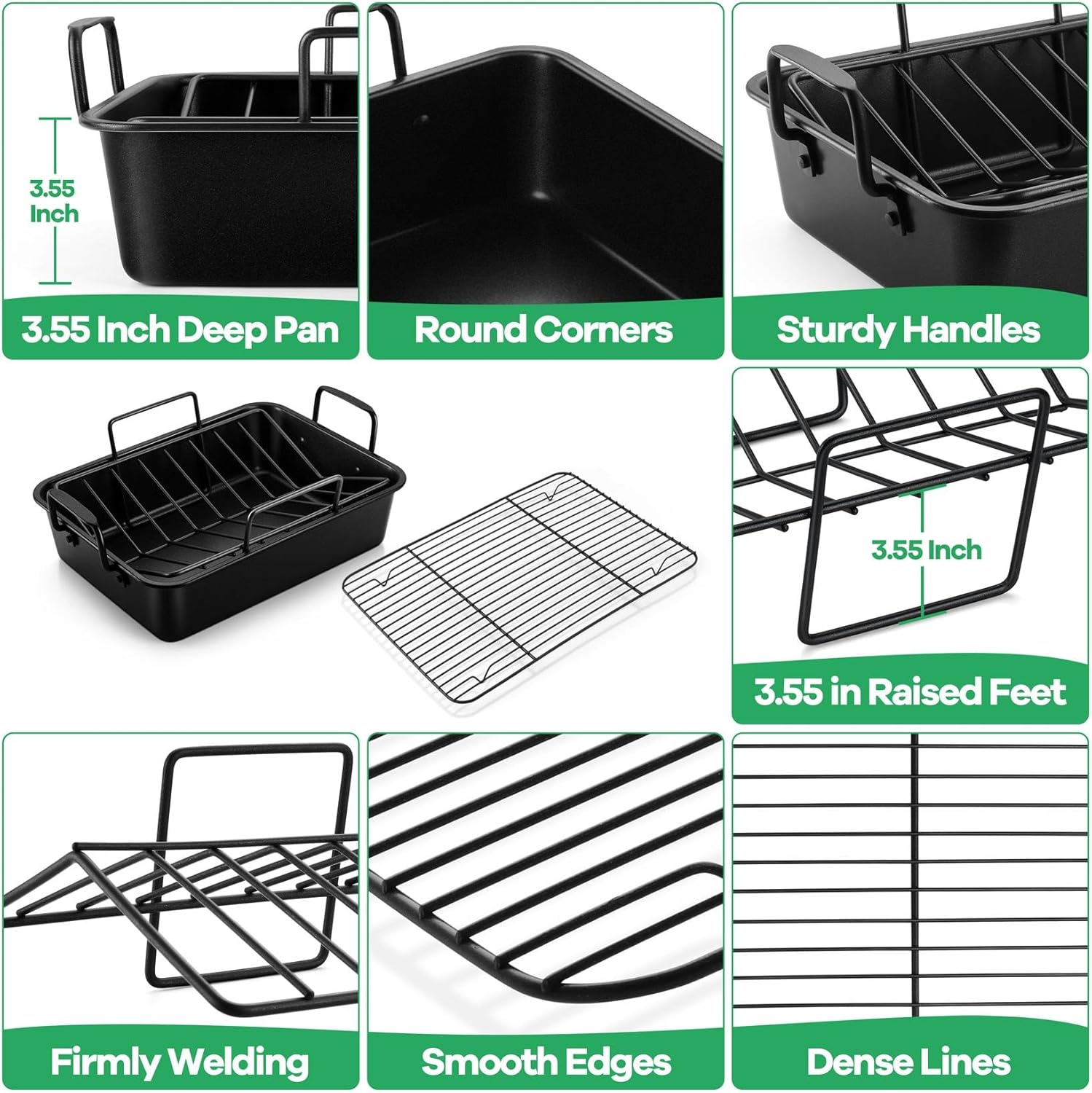 - 【NON-TOXIC & DURABLE】P&P CHEF non-stick roasting pan with baking racks are made of food-grade material without harmful substance releasing to your food, Oven safe up to 450℉, Heavy-duty stainless steel core structure makes them more rust-proof and sturdier than aluminum pan rack or other normal metal core nonstick pan rack