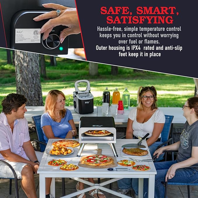 - TOOLS OF THE TRADE - This pizza oven comes complete with a range of essential accessories. Included in the package are a Pizza Cutter, Pizza Peel, 2-in-1 Pizza Stone, Brush, Pie Server, and Recipe Book. IMPORTANT: For optimal performance and safety, only use extension cords rated 10 - 14 AWG if one is necessary. Avoid using insufficient light-duty extension cords as they may compromise the oven's performance and pose a fire hazard.