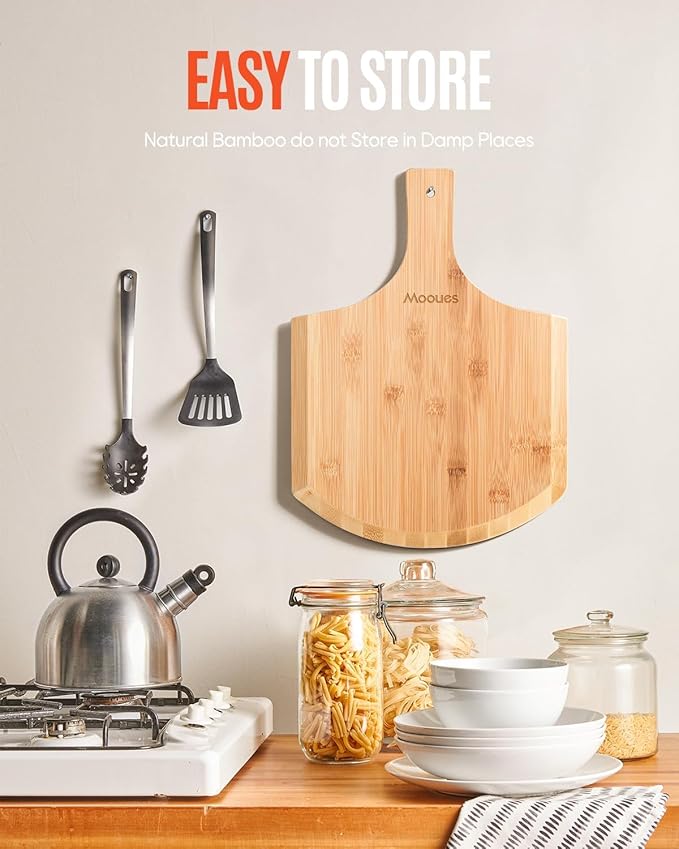 - EASY TO CLEAN & STORE:With its smooth polished surface, our pizza turning peel is a breeze to clean. Simply wipe it clean with a damp cloth, then dry it thoroughly with a clean towel before setting it aside to air dry. And when it comes to storage, you'll appreciate the convenience of the hole in the handle, allowing you to easily hang the pizza board on kitchen racks, keeping it within reach while saving valuable space