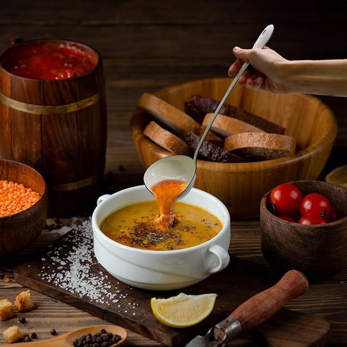 - LADLE OF USAGE ADVANTAGE : The soup gravy ladle looks good and is very shiny which helps keep food from sticking to it, the soup ladle spoons of pour spouts make it so much easier to pour into smaller containers, whether it's serving soup or pouring oil, large spoon with long handle that can prevents burns from heat sources.