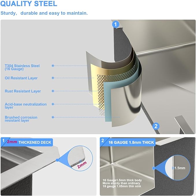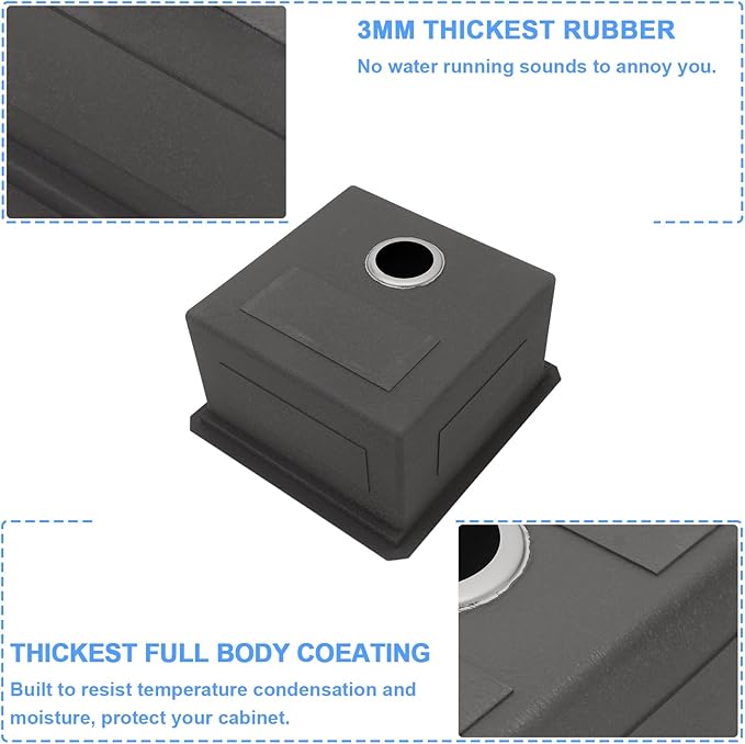 - CONDENSATION & NOISE PROOF: This undermount kitchen sink has anti-condensation coating and thick rubber padding on the sink bottom which can alleviate condensation and noise that caused by the temperature difference, dropped utensils , and running high pressure water.