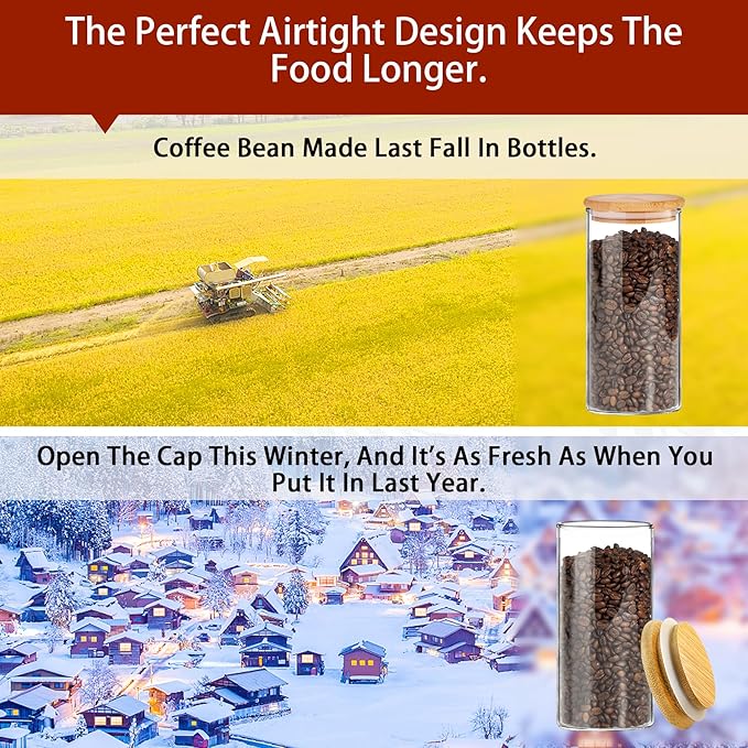 - Widely Use: The 32 oz glass jars with bamboo lids are perfect for your kitchen, pantry. Glass containers with bamboo lids can be sealed to preserve food such as coffee Beans, rice, sugar, nuts, grains, flour, tea, candy, oatmeal, spices etc. Use these bamboo lid jars in the bathroom to store bath salts/cotton swabs etc. In addition, the glass jar with bamboo lid can also be used to store cat/dog treats, seeds, etc. These bamboo containers are ideal for sorting and storing your food and sundries.